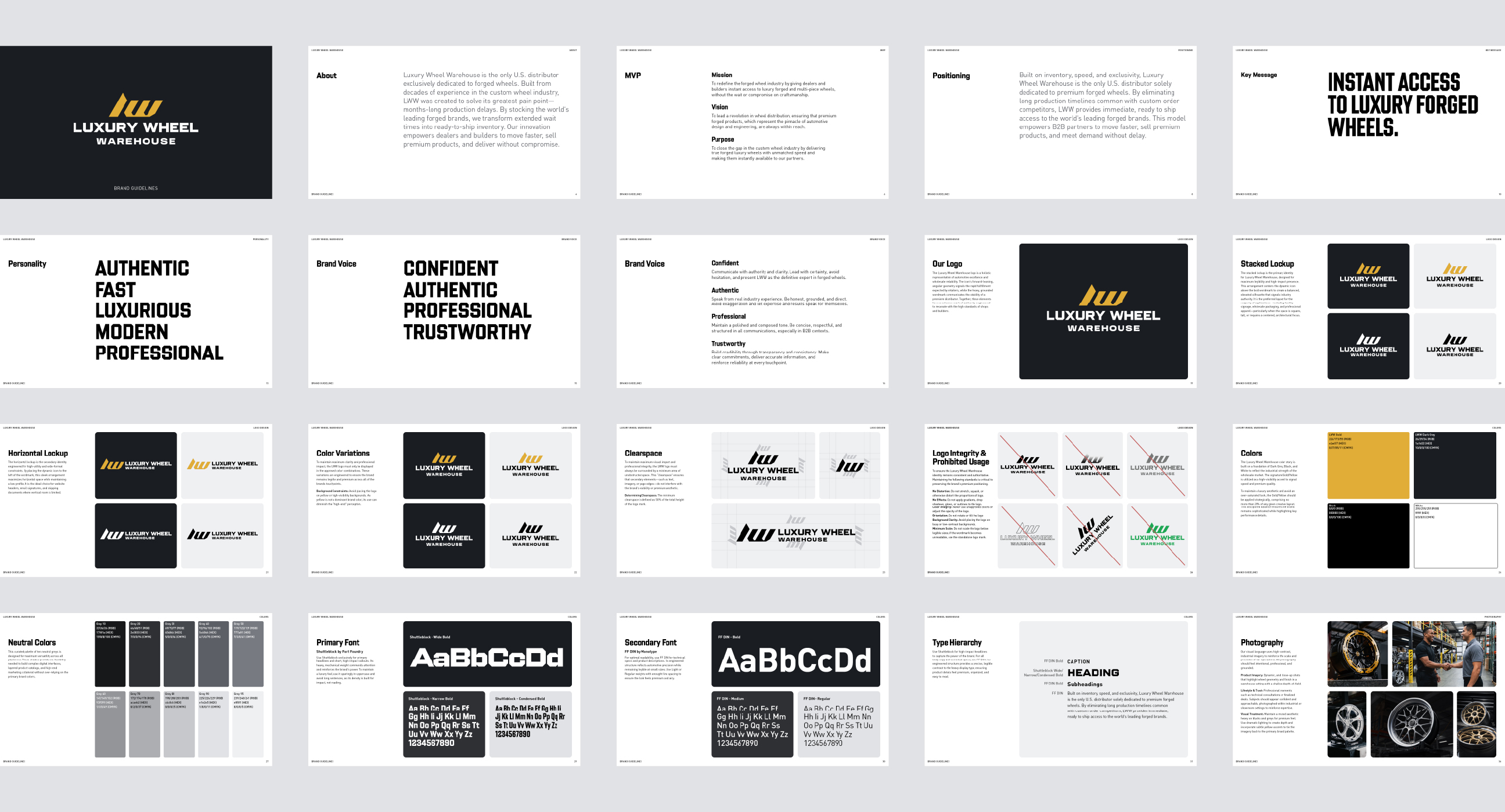 Luxury Wheel Warehouse is the nation’s only forged wheel exclusive distributor, built to eliminate industry wait times and give dealers instant access to premium multi-piece wheels. The objective was to define a strategic brand identity that clearly differentiated LWW from mass market competitors and positioned it as the essential partner for luxury wheel retailers. I led brand strategy and visual identity development, translating speed, exclusivity, and partnership into a bold, minimal system. The challenge was balancing luxury with warehouse accessibility. The final identity reinforces authority, clarity, and performance while supporting scalable growth.
